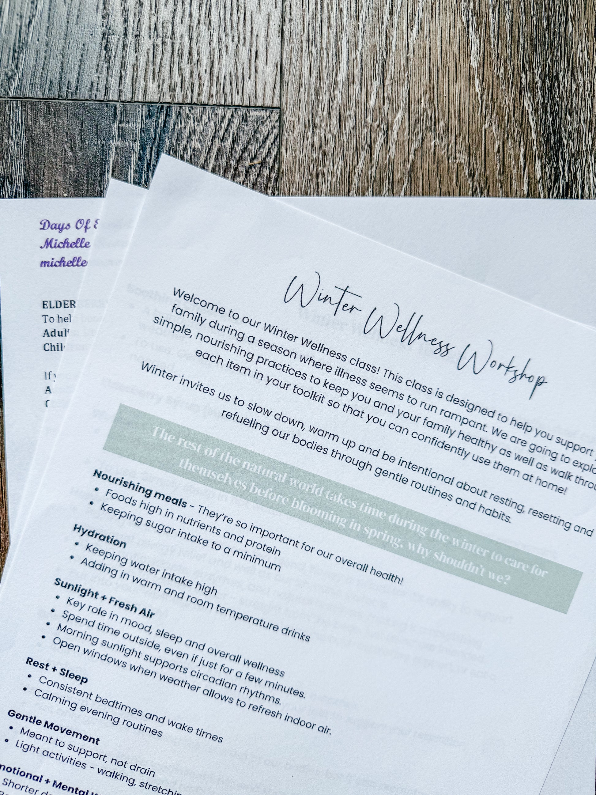 Each toolkit includes access to our digital Winter Wellness Guide, featuring expanded class content, seasonal wellness principles, simple rituals, and tips for using each item in your kit. Perfect for revisiting the class experience at home.